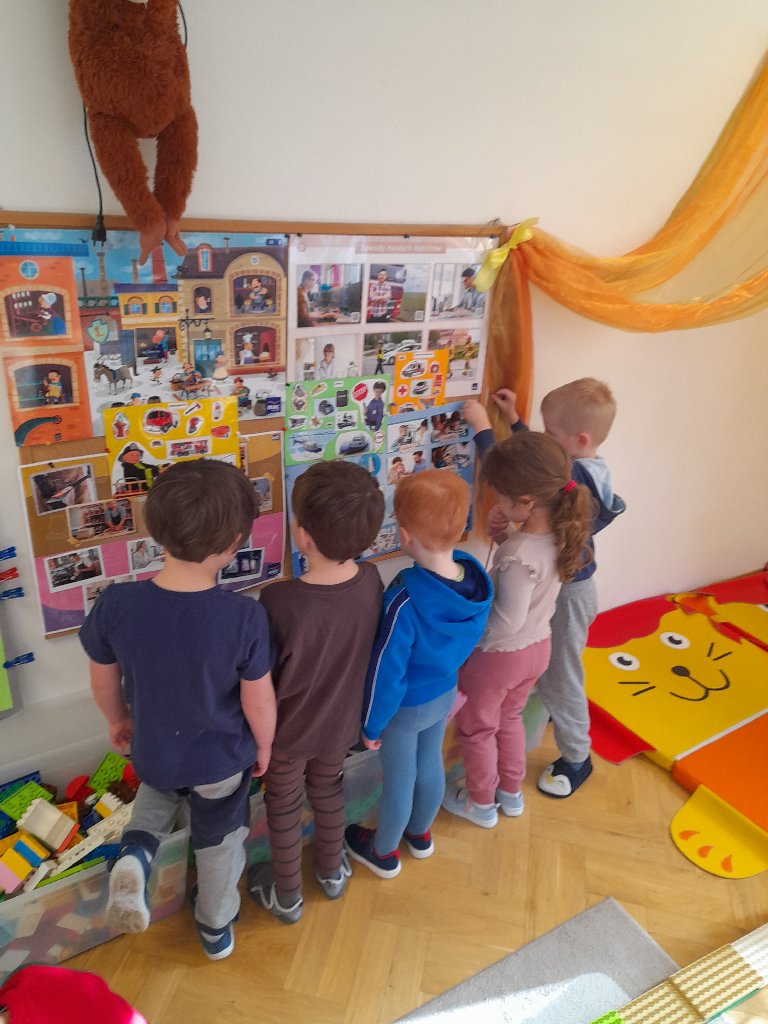 - wzbogacanie słownictwa o nazwy różnych zawodów i rozwijanie umiejętności wypowiadania się na ich temat, zachęcanie do dokonywania wyborów zawodów według aktualnych zainteresowań i chęci dzieci;